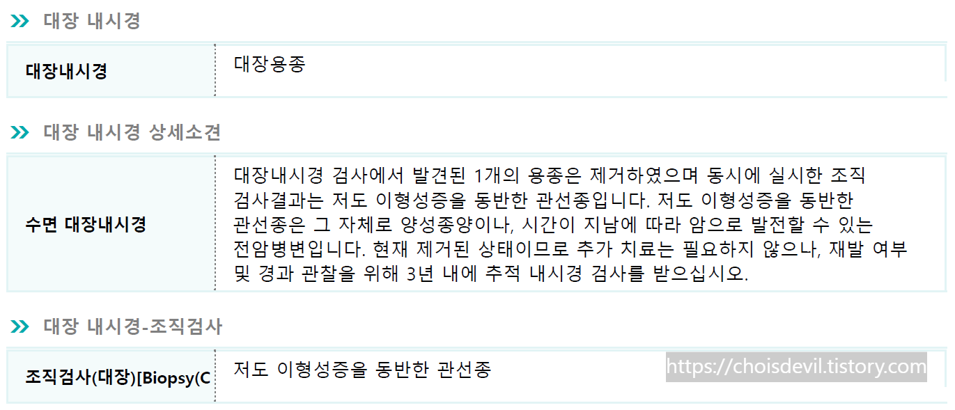 대장내시경에서 제거한 용종은 다행히 5mm 정도의 작은 용종 1개로, 생각보다 큰 사이즈는 아니었습니다. 하지만 건강검진에서 나온 소견 결과와 조직검사 결과도 보험금 청구 요건에 굉장히 중요한 부분 중 하나입니다. 보통의 용종은 저도, 고도 이형성을 나뉘게 되는데 암으로 발전될 가능성이 낮은 종이냐, 높은 종이냐를 구분하는 것이더라구요.